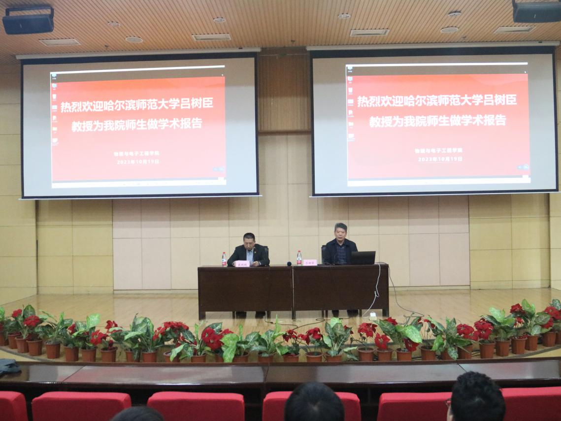 10月19日,哈尔滨师范大学吕树臣教授应beat365官网邀请,在昆仑校区国教楼三楼会议室作了题为“稀土掺杂钨(钼)酸盐基纳米红色荧光粉的制备和发光性质的研究”的学术报告。报告由beat365在线唯一官网登录副院长戴鹏鹏教授主持。学院领导及师生共计200余人听取了报告。