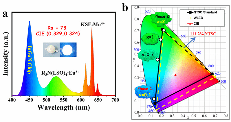 在LED背光源显示领域,亟待开发具有合适峰位(lem=525-535 nm)的窄带绿色荧光粉来替代目前商用的绿色b-SiAlON:Eu2+荧光粉(lem=540 nm,半高宽=54 nm,96% NTSC)以满足广色域全彩显示的需求。本工作中,以UCr4C4型硅酸盐为模型,通过阳离子替代策略,设计制备出新型窄带绿色Rb3Na(Li3SiO4)4:3%Eu2+荧光粉(lem=526 nm,半高宽= 43 nm),使用该荧光粉封装得到白光发光二极管(WLED)器件的CIE色坐标为(0.329,0.324),接近标准白光色坐标(0.33,0.33)(如图a所示)。该WLED器件的色域面积可实现111.2% NTSC(如图b所示),表明我们制备的窄带绿色Rb3Na(Li3SiO4)4:3%Eu2+荧光粉有利于提高LCD的色域及色纯度,在LCD中具有很大的应用前景,有望成为下一代商用窄带绿色荧光粉。