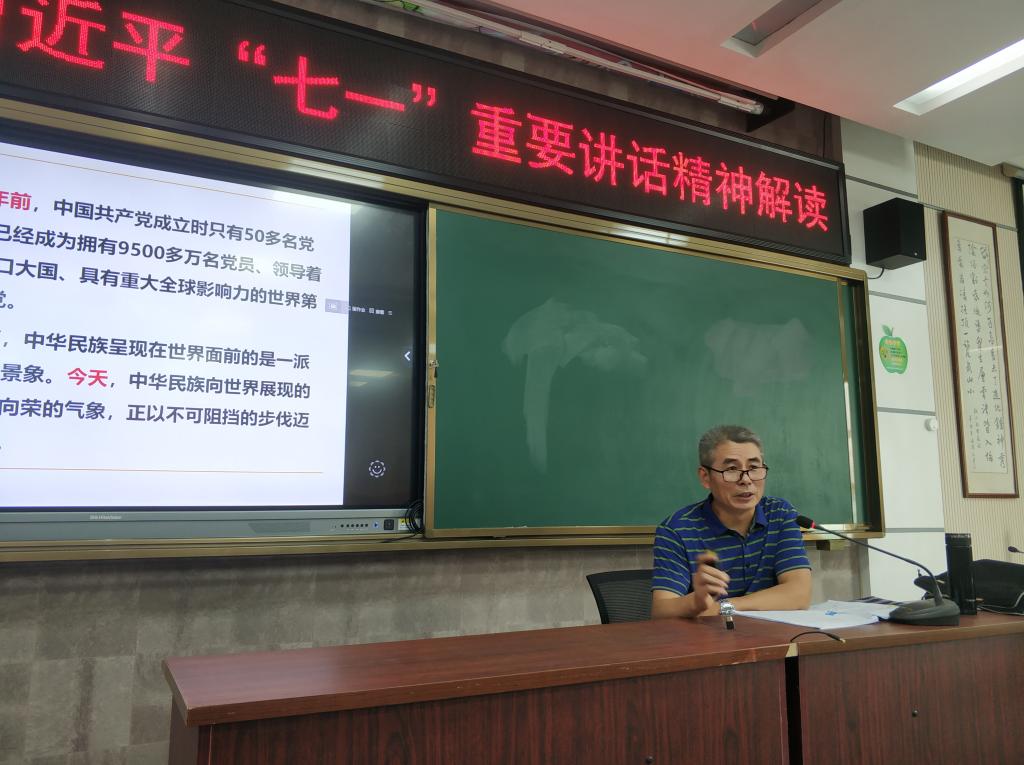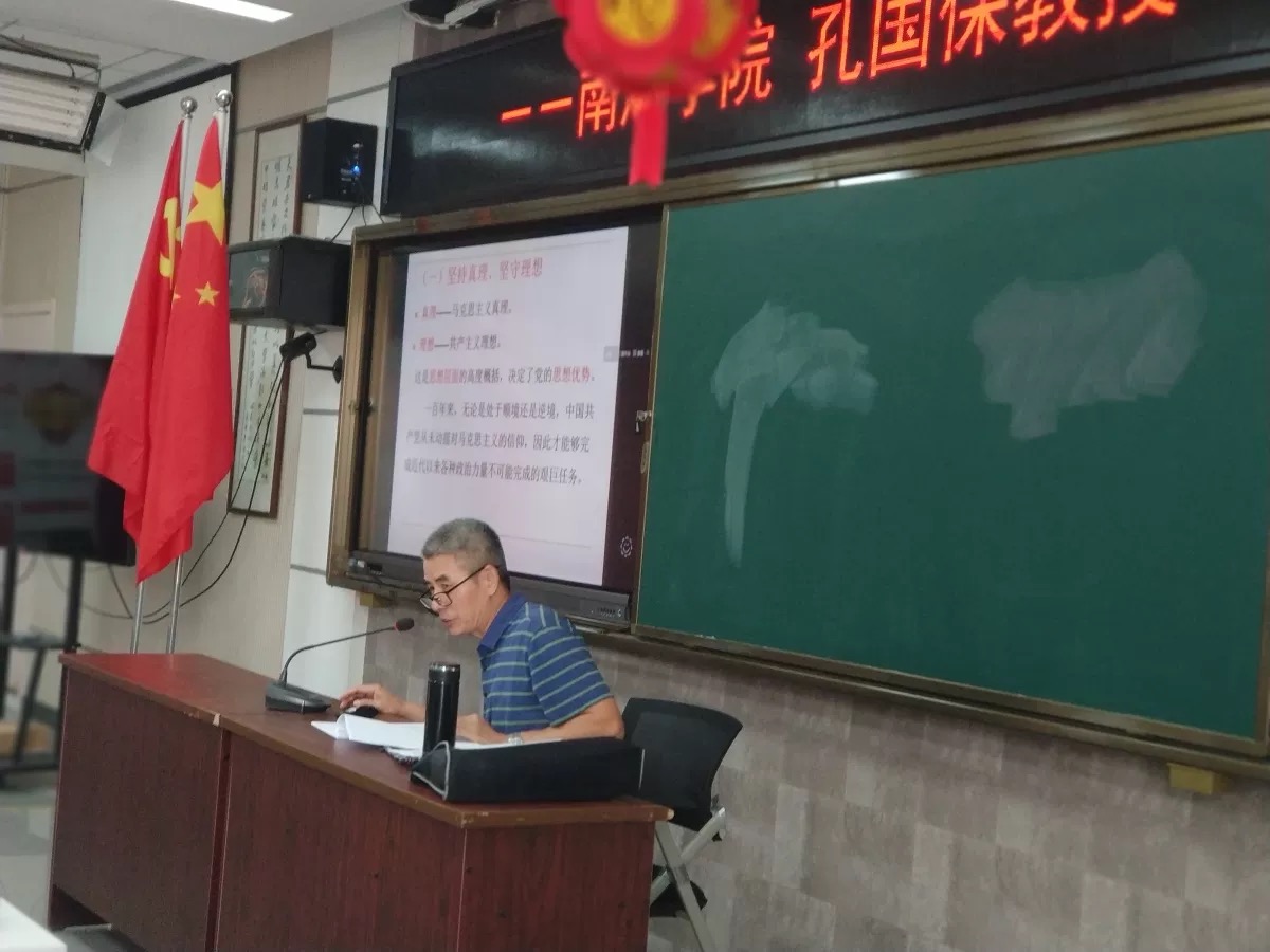 宣讲中,孔教授以习近平总书记“七一”重要讲话精神为主题,以深入剖析“中国共产党诞生的历史背景和初心使命”为理论起点,分别从“中国共产党的四个伟大成就和四个庄严宣告”、“伟大建党精神”、“党的无上荣光与党群血肉联系”四个方面展开,将“以史为鉴、开创未来,九个必须坚持”作为实践归宿,号召每位教师,坚持真理、坚守理想,践行初心、牢记使命,在教书育人的岗位上绽放光彩。