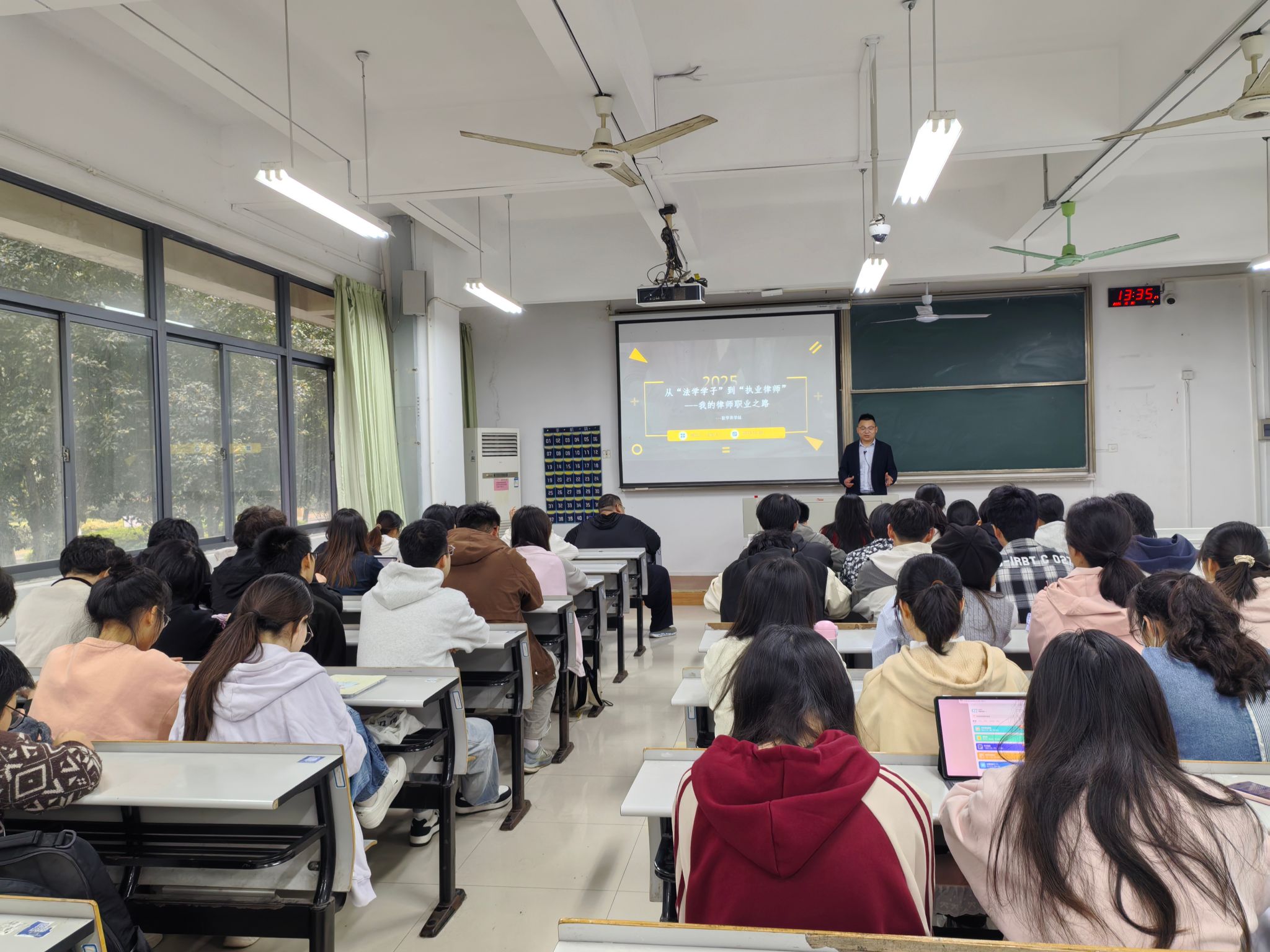 2025年10月30日下午,嘉兴南湖学院迎来了一位特殊的分享者——2005级南湖学院法学专业校友、浙江开发律师事务所的宋军飞律师。他为在校的学弟学妹们带来了一场题为《从“法学学子”到“执业律师”——我的律师职业之路》的精彩讲座。宋军飞以其真挚的情感、丰富的实践经验和深刻的行业洞察,为同学们描绘了一幅真实而充满启发的律师职业发展图景。