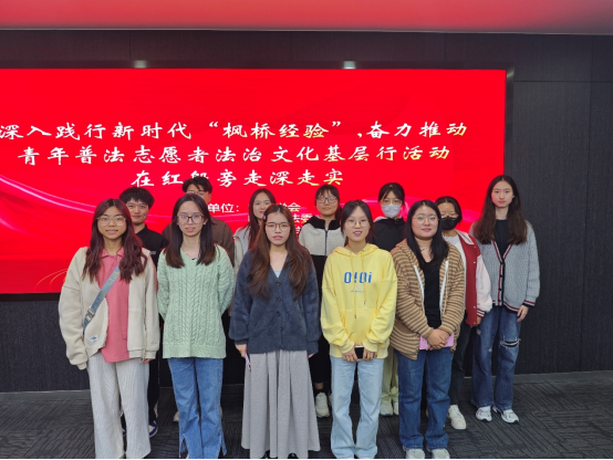 11月23日下午,嘉兴南湖学院awc777万象城娱乐官网法学专业教师胥玲英、殷杰敏带领学生参加“深入践行新时代‘枫桥经验’,奋力推动青年普法志愿者法治文化基层行活动在红船旁走深走实活动”。活动由南湖区委政法委、区法学会、区社会治理中心联合举办。