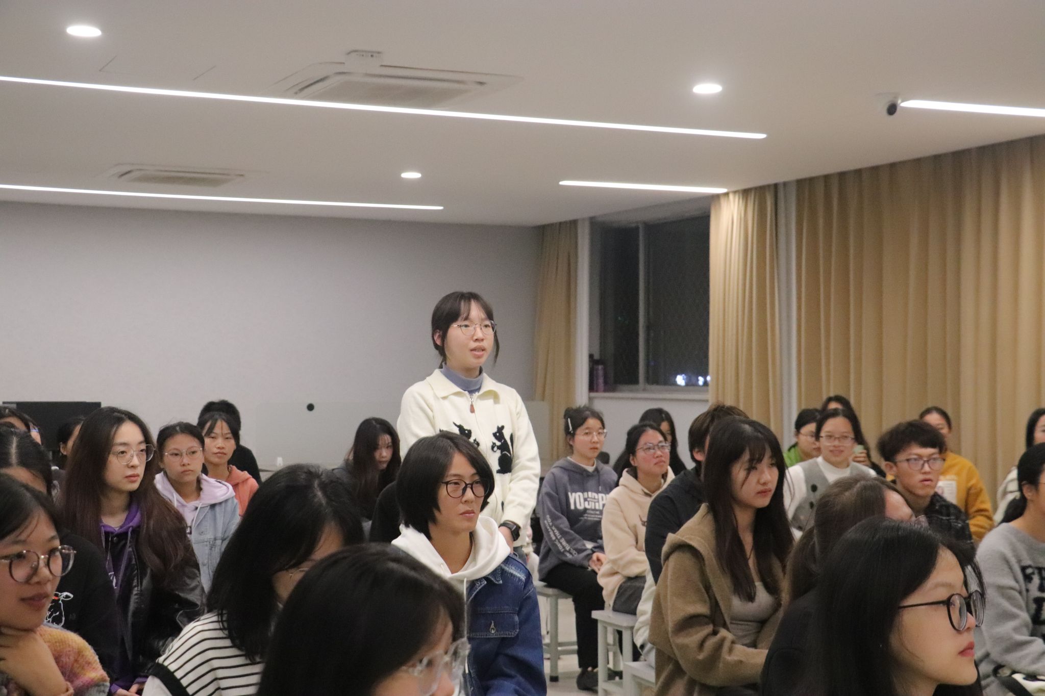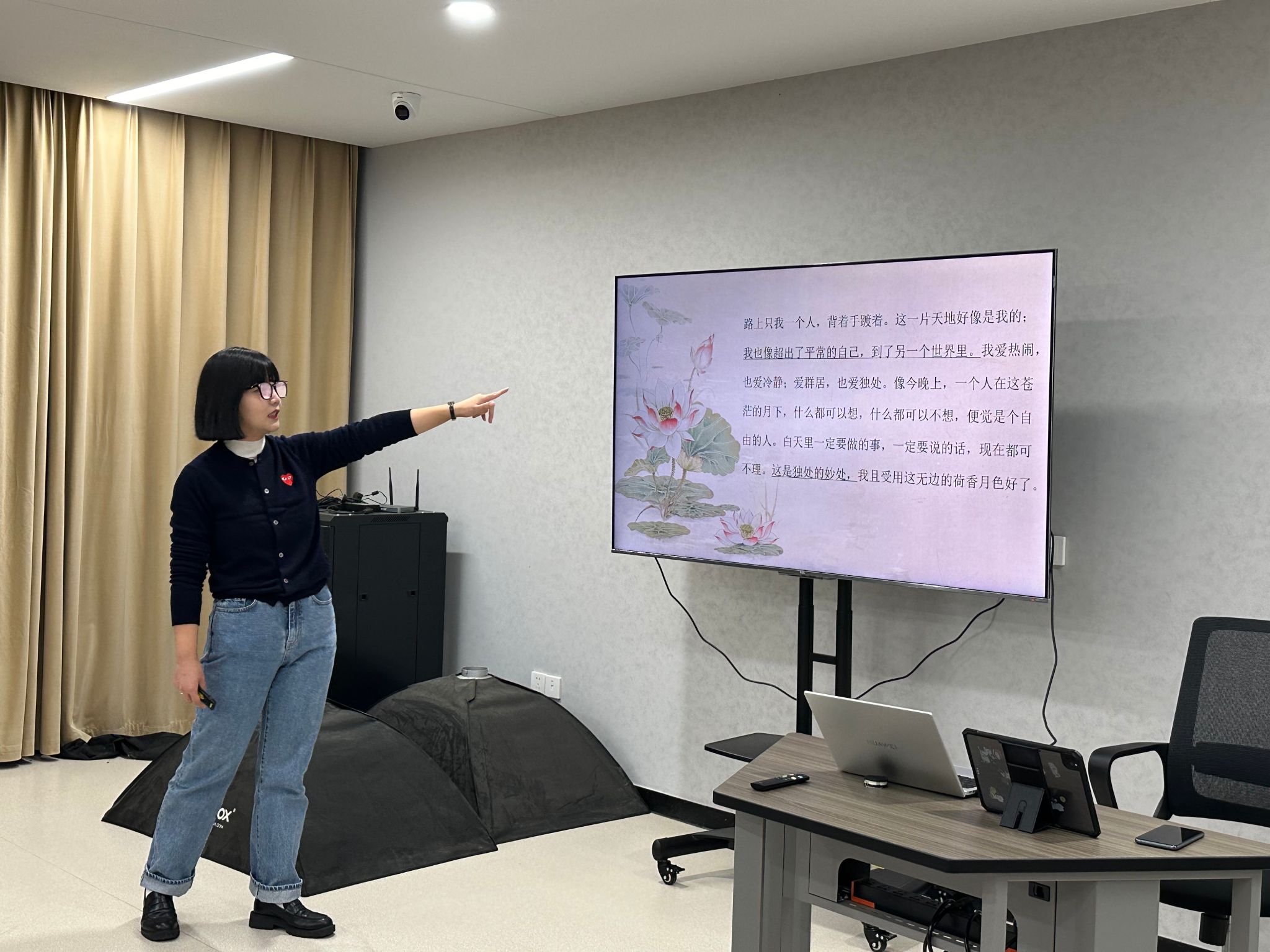 讲座中,童涵冰老师精选了朱自清的《荷塘月色》、 周邦彦《苏幕遮》等诸多散文、诗词片段与同学们阅读欣赏,并从各个角度讲述自己对散文阅读和写作的独特见解。她还就散文和诗词创作的构思和技巧等方面与同学们进行了充分互动交流。