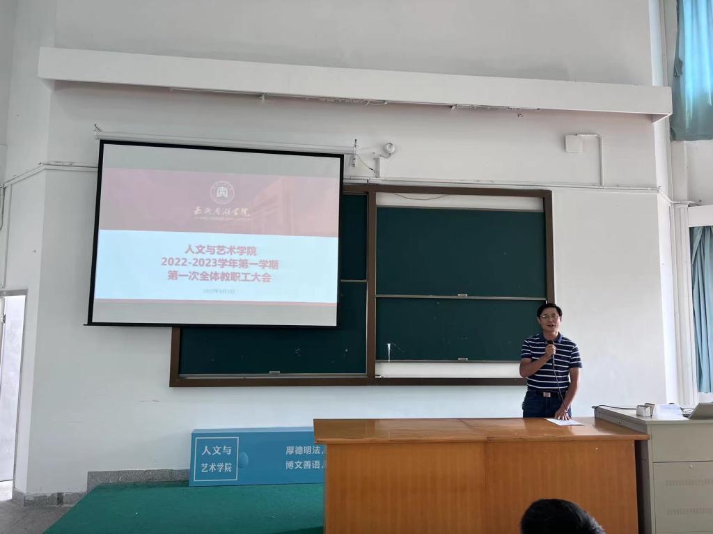 2022年9月1日下午,awc777万象城娱乐官网在人文楼310会议室召开2022-2023学年第一学期第一次全体教职工大会,会议由学院副院长赵伯祥主持,学院党委副书记杨燕群主要传达学校中层干部暑期读书会会议精神。