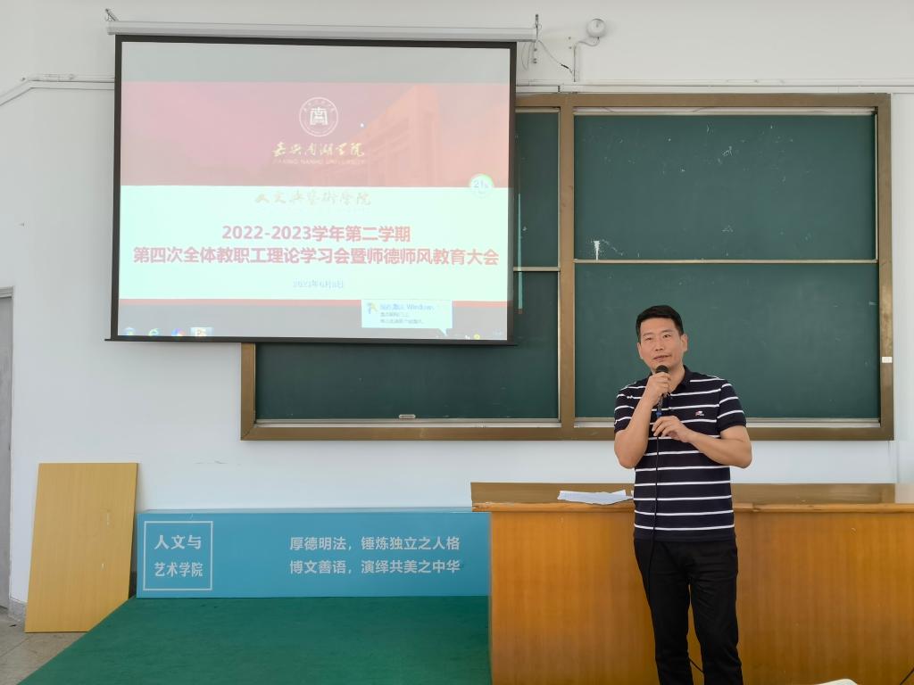 6月8日下午awc777万象城娱乐官网在人文楼310教室召开了2022-2023学年第二学期第四次全体教职工理论学习会暨师德师风教育大会。学院副书记杨燕群、副院长赵伯祥主持会议、学院全体教职工参加会议。