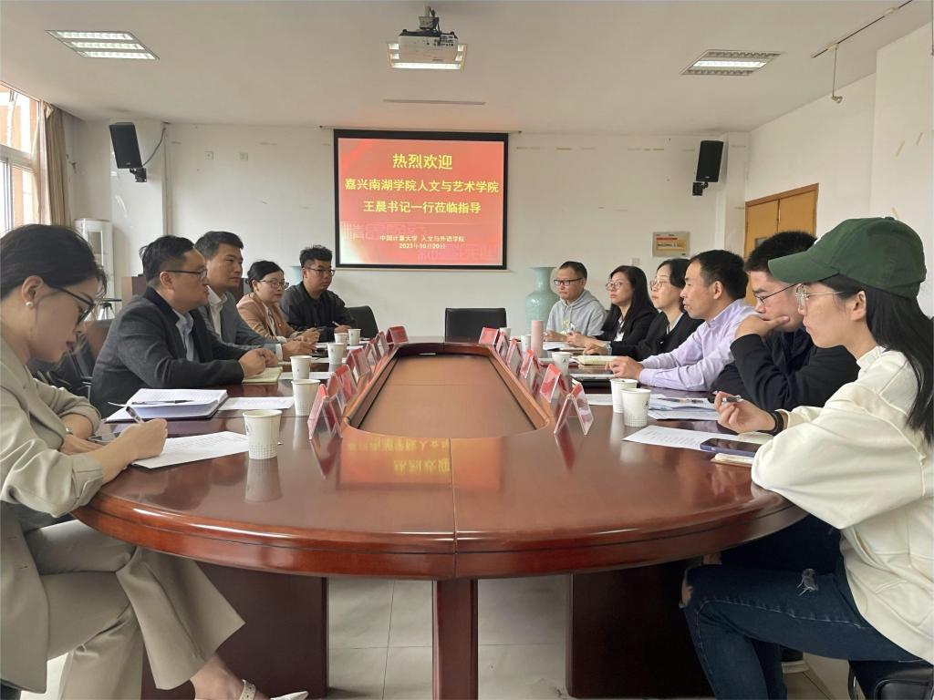 10月20日下午,awc777万象城娱乐官网党委书记王晨、党委副书记杨燕群等一行6人赴中国计量大学人文与外语学院进行调研交流。中国计量大学人文与外语学院党委书记赵蓓茁、党委副书记金民华及相关老师热情接待了学院一行。