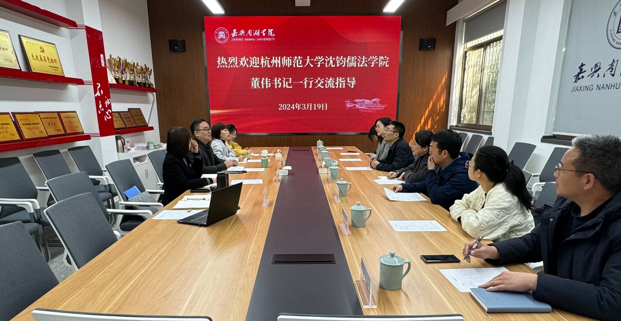 3月19日,杭州师范大学沈钧儒法学院党委书记董伟教授一行七人来万象城开展交流座谈,双方围绕基层党建品牌建设和教工党支部书记“双带头人”培育主题进行研讨。学院党委书记王晨、党委副书记罗景群以及法学专业教工和学生党支部书记参加座谈。