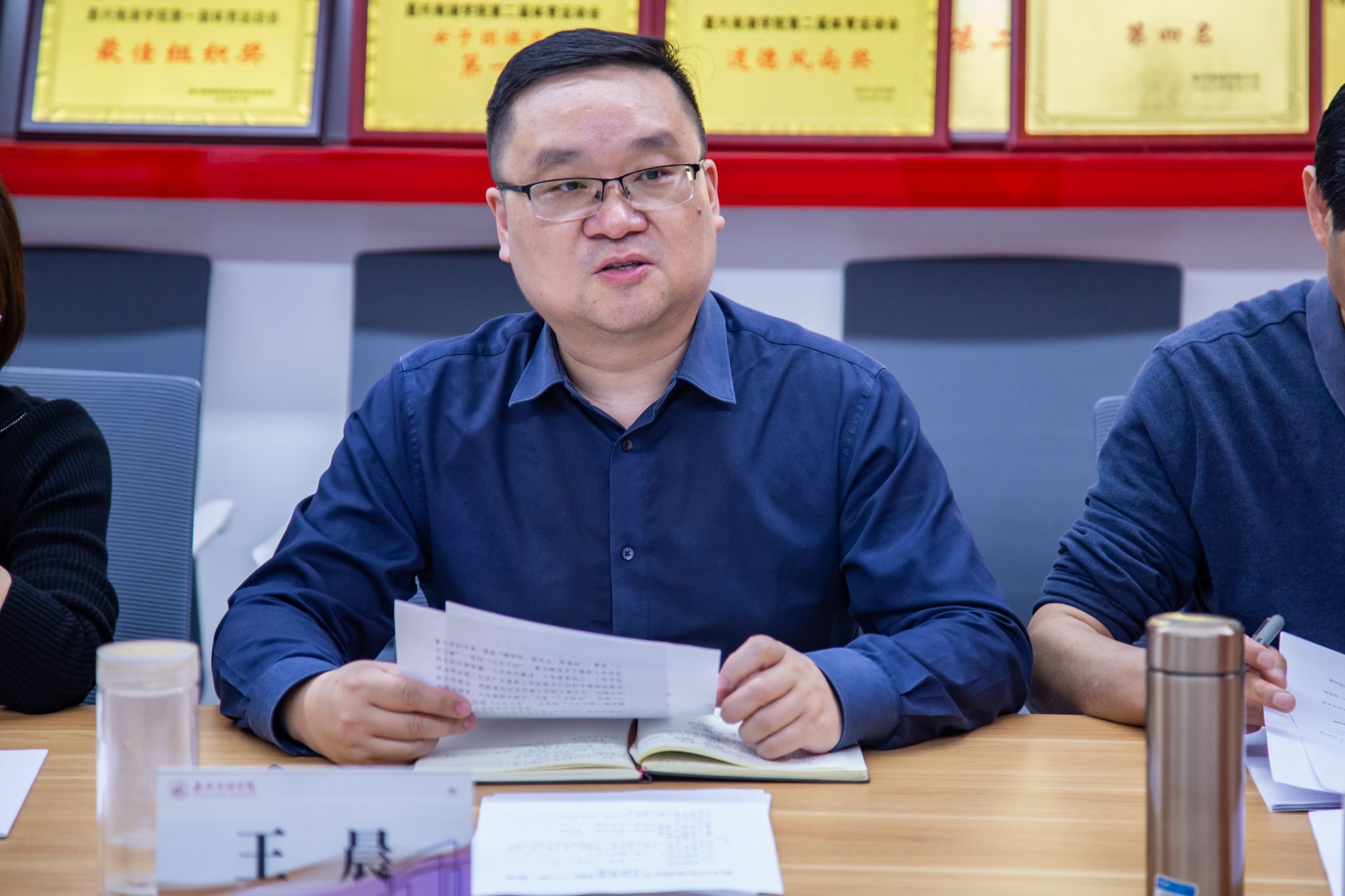 会上,学院党委书记王晨就学院“三风”建设做了整体汇报。他表示,开展“三风”建设,就是要使学校“守正创新,求实奋进”的校训内化为师生的精神追求,外化为师生的自觉行动。下一步,学院将重点开展“三个到底”人文之问大讨论、推进“三短三讲”人文作风效能革命、在全院倡导培育人文师生“五个意识”,努力为学校“三个大学”建设提供坚强的政治思想和作风保障。