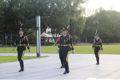 七时许,国旗仪仗队的学生们迈着整齐划一、铿锵有力的步伐,护送着五星红旗到达旗杆下。伴随着嘹亮国歌,旗手扬起手中的五星红旗,师生肃立,深情凝望着冉冉升起的五星红旗。