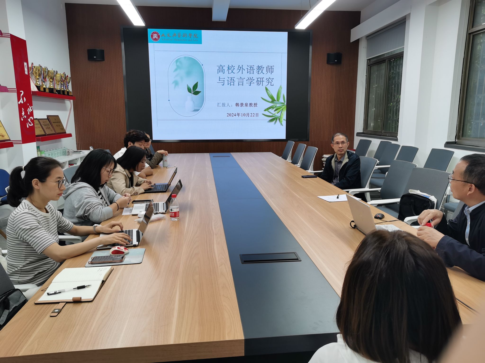 10月22日上午,广东外语外贸大学云山杰出学者、二级教授、博士生导师韩景泉教授应邀作客万象城文心讲堂,围绕“高校外语教师与语言学研究”主题为英语专业师生作学术讲座。学院党委书记王晨、英语专业全体教师、基础英语部教师及部分学生参加了本次讲座。讲座由英语专业负责人李柽杨主持。