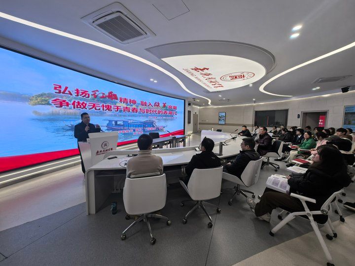贾文胜以“弘扬红船精神 融入改革浪潮 争做无愧于青春与时代的弄潮儿”为题,带领师生回顾建党百年的光辉历程、重走中共一大代表们的人生轨迹、解构中国共产党卓越领导力的基因密码。