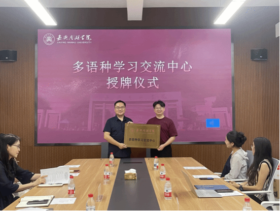 在与会人员的共同见证下,双方代表共同签署了“欧罗教育发展基金”捐赠协议书。王晨与朱烜共同为“嘉兴南湖学院多语种学习交流中心”揭牌。